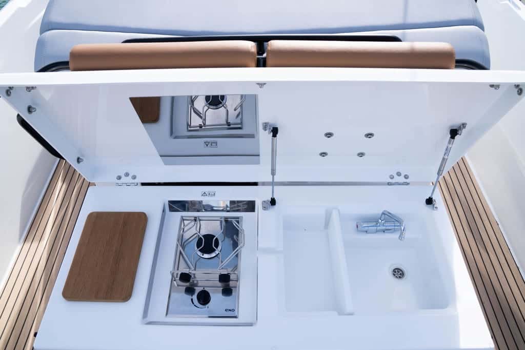 En cubierta, el Flyer 9 Spacedeck se convierte en un escenario versátil donde cada rincón invita a disfrutar. Dos generosos solariums, uno en proa y otro en popa, ofrecen espacios para tomar el sol o dejarse mecer por la brisa marina. El solárium de popa acoge cómodamente hasta tres personas, mientras que en proa, el toldo bimini despliega su sombra para quienes buscan resguardarse y contemplar el horizonte.
