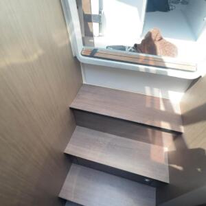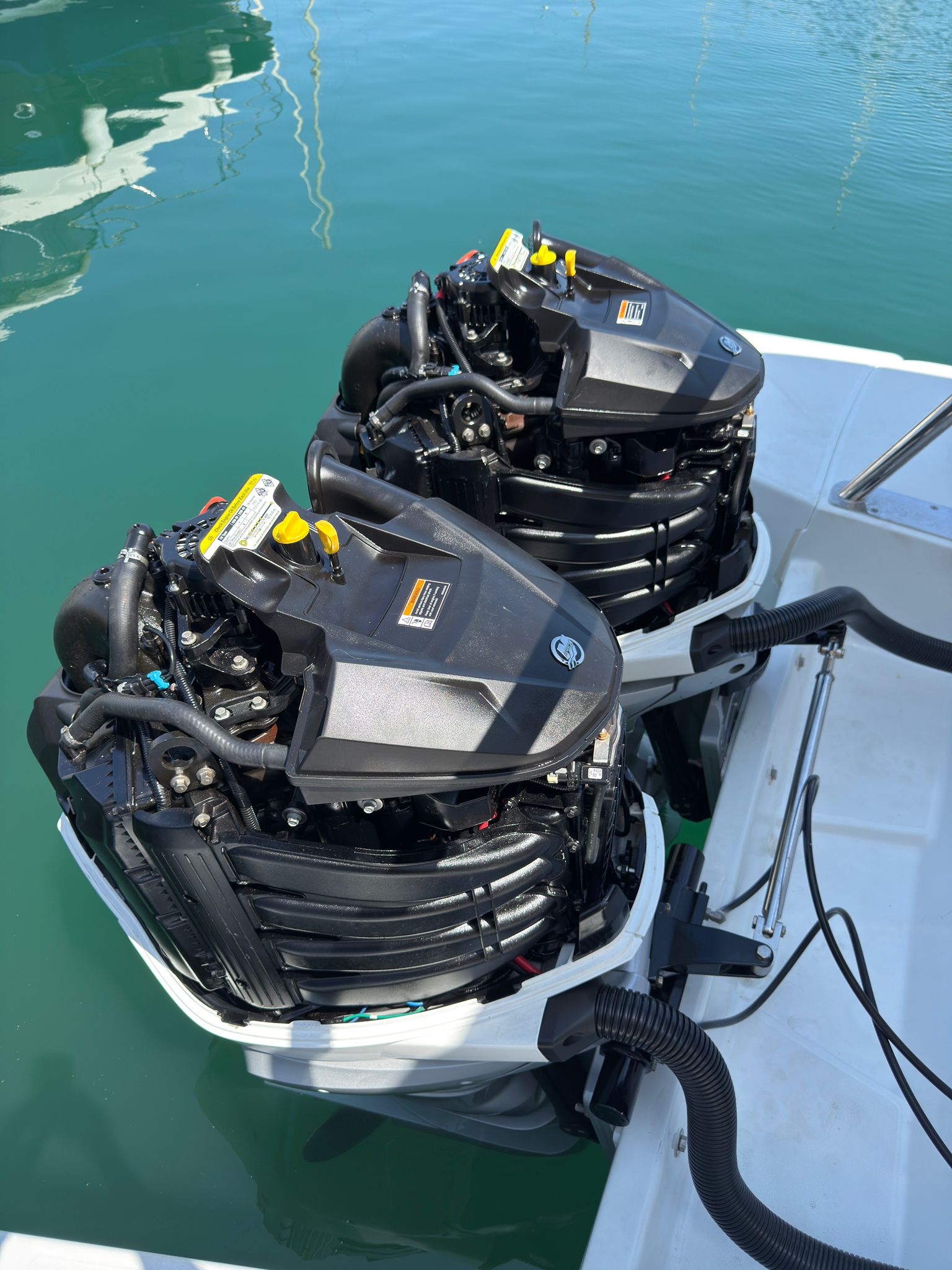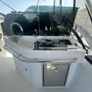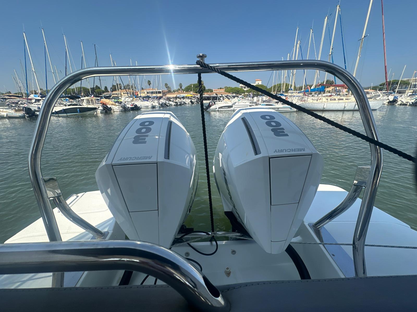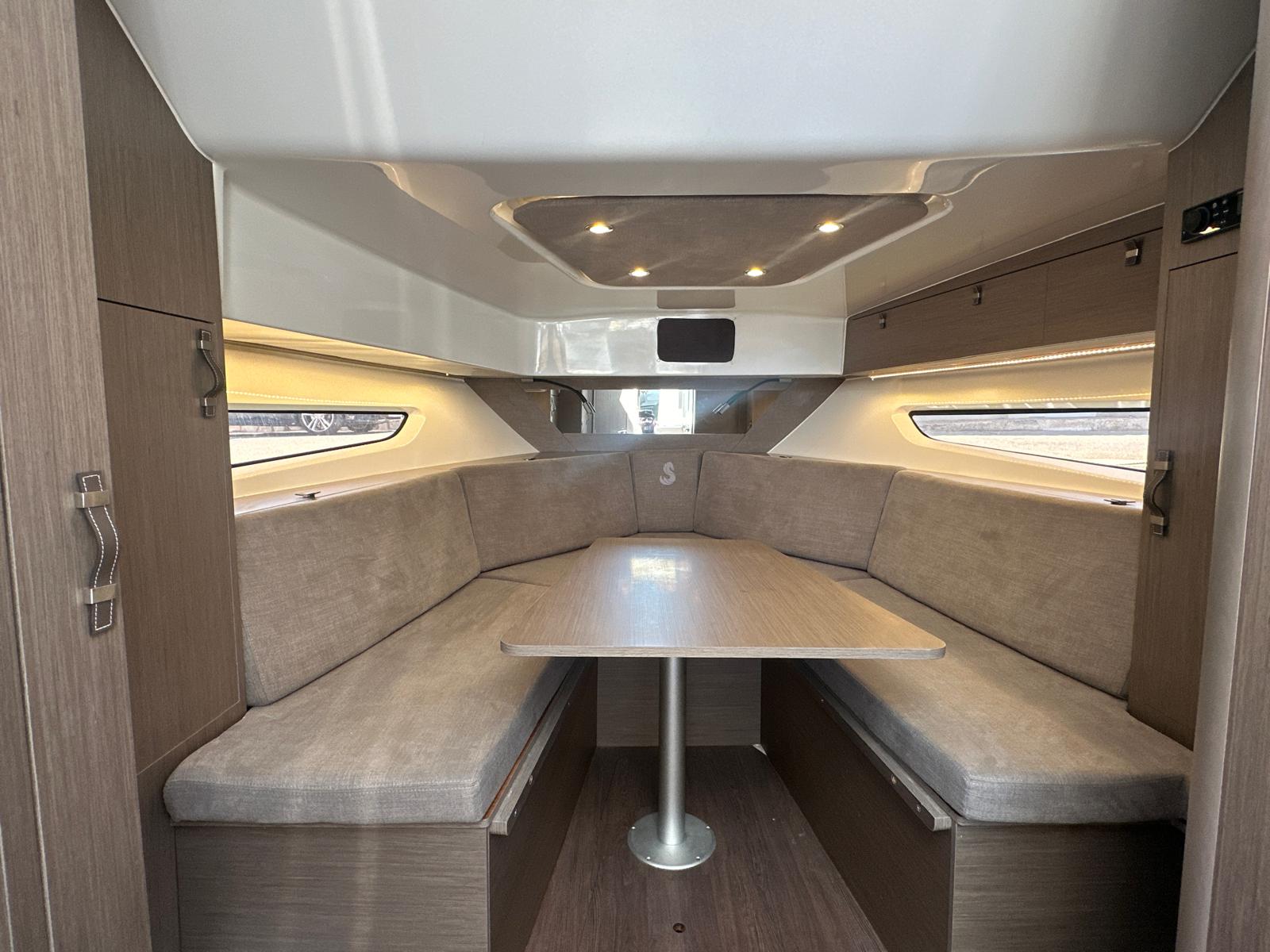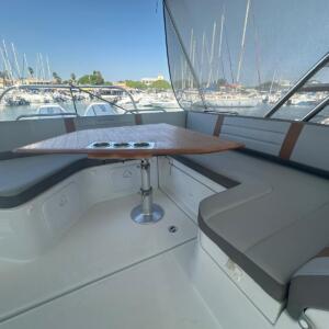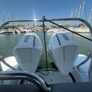 La bañera cuenta con asientos modulables, mesa central y amplias zonas de solárium en proa y popa, pensadas para el relax y la convivencia a bordo. El puesto de gobierno es ergonómico, con excelente visibilidad y fácil acceso a todos los controles, lo que garantiza una navegación segura y agradable. Su configuración con dos motores fueraborda proporciona una respuesta potente, eficiente y estable en todo tipo de condiciones.
