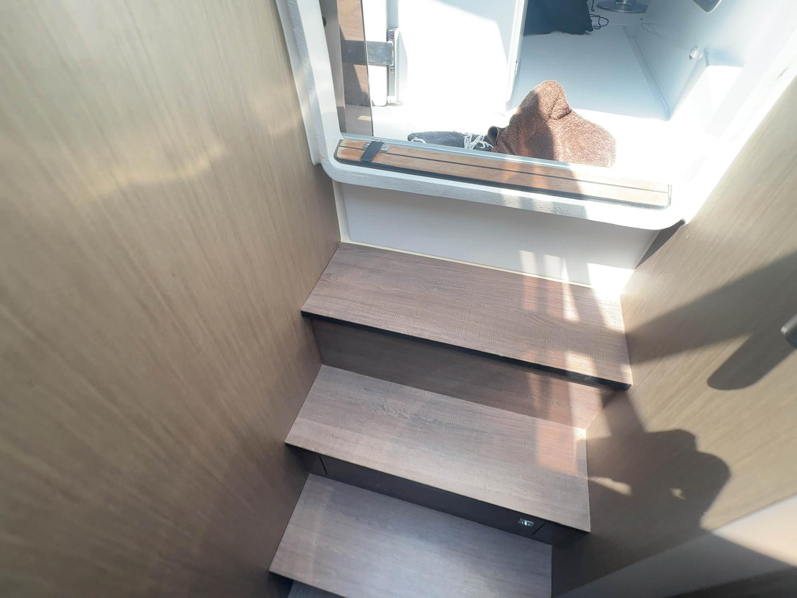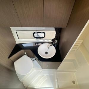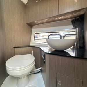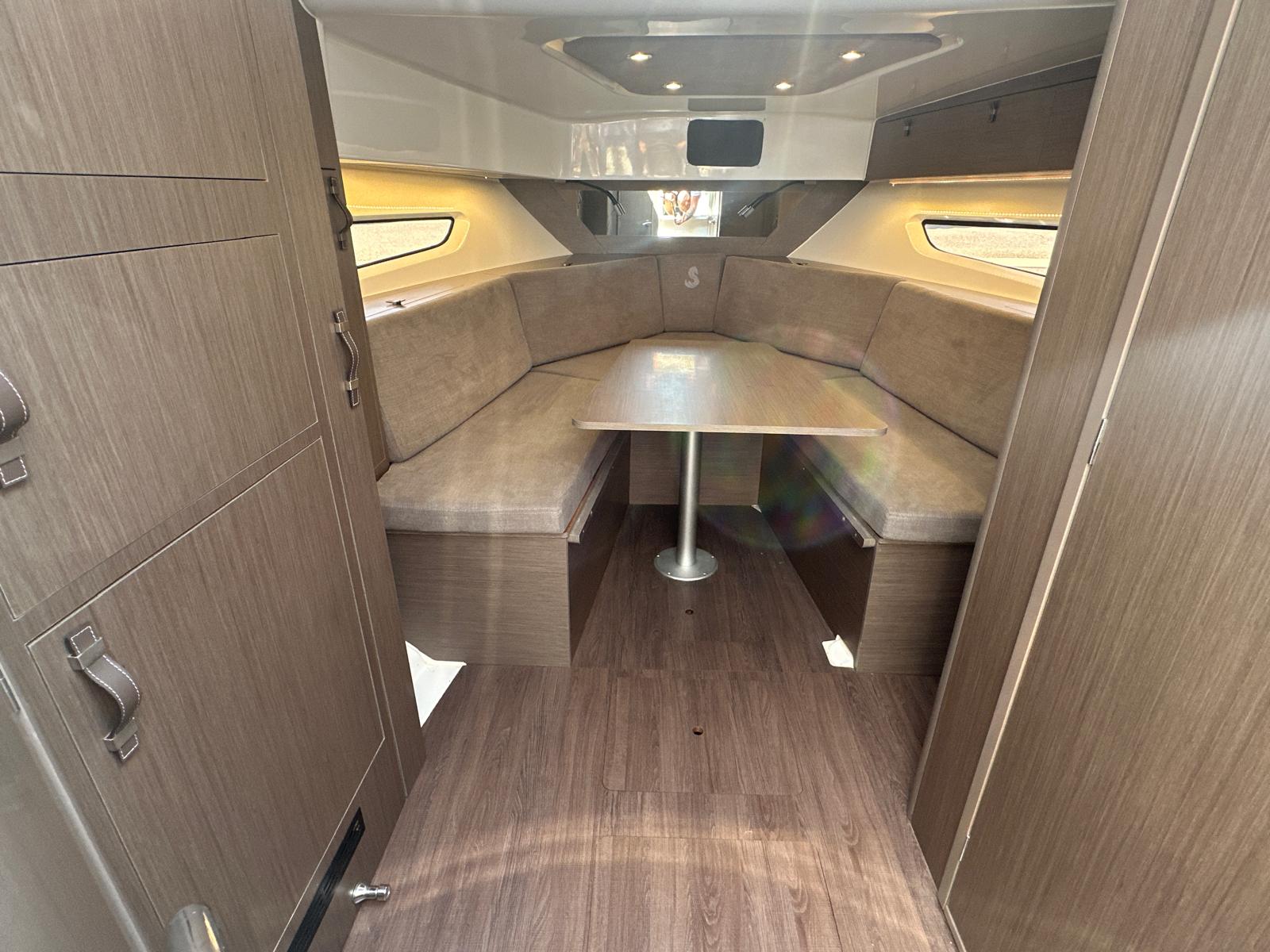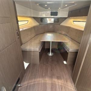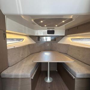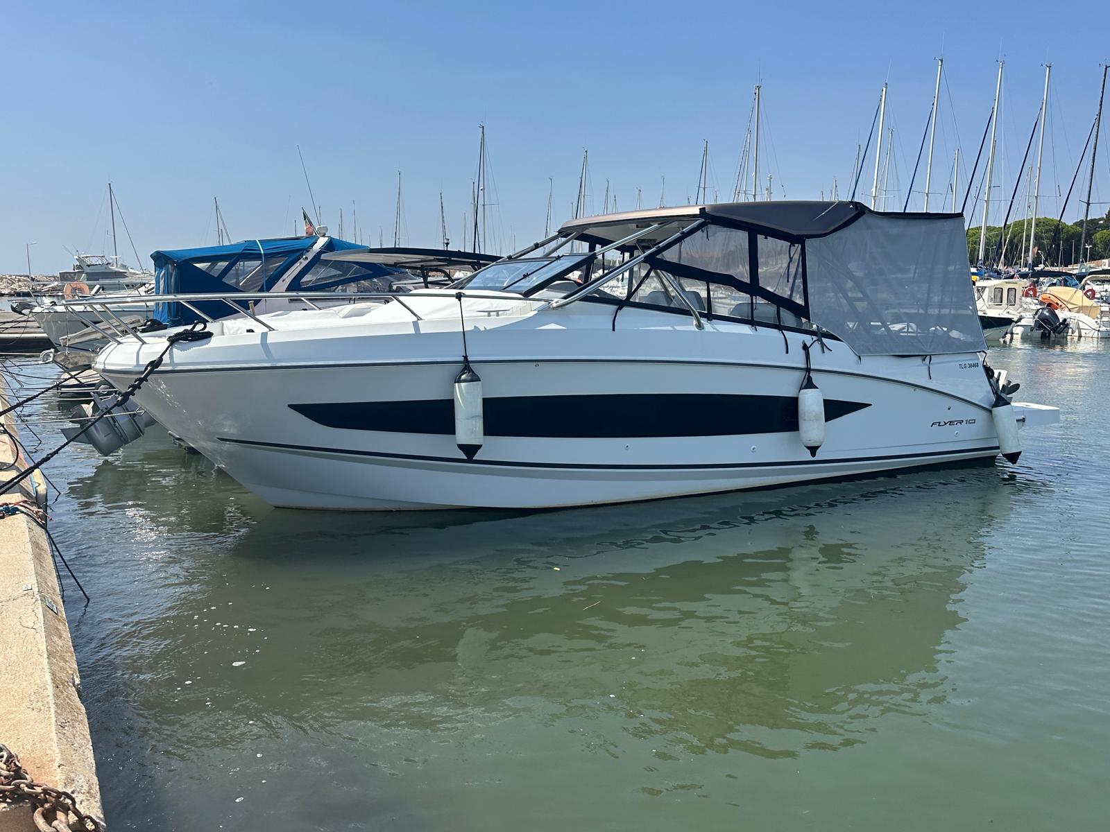 En el interior, el Flyer 10 ofrece una cabina sorprendentemente espaciosa, con literas confortables y baño independiente, permitiendo pernoctar a bordo con total comodidad. Dispone además de espacios de almacenamiento bien integrados y equipamiento funcional que lo convierten en una opción muy completa para quienes buscan un barco versátil, elegante y preparado para disfrutar del mar sin renuncias.
