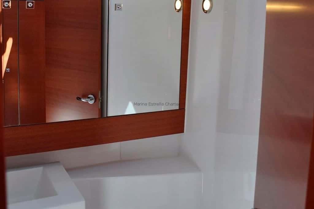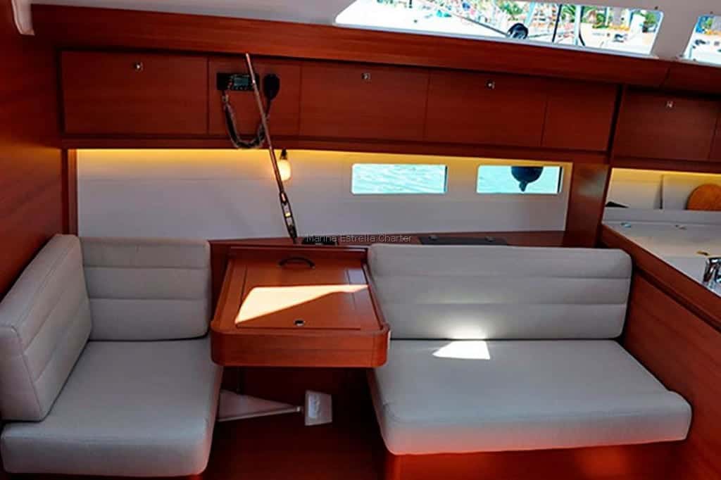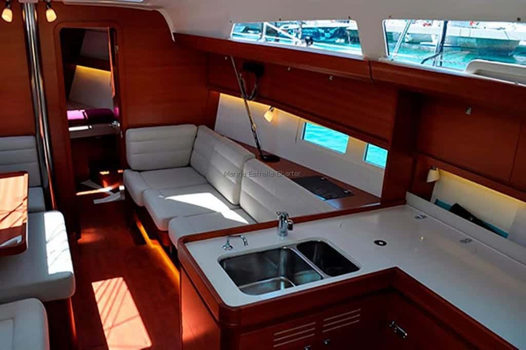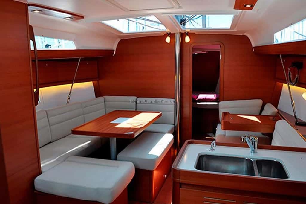 El diseño del Dufour 412 Grand Large, moderno y acogedor, está pensado para compartir momentos con quienes más quieres. Tres cabinas dobles ofrecen refugio tras una jornada de navegación, mientras que el salón convertible invita a prolongar las veladas bajo la luz tenue de las estrellas. Dos baños aportan comodidad y privacidad, permitiendo que hasta ocho personas disfruten a bordo tanto de la travesía diurna como de noches serenas fondeados en aguas tranquilas.