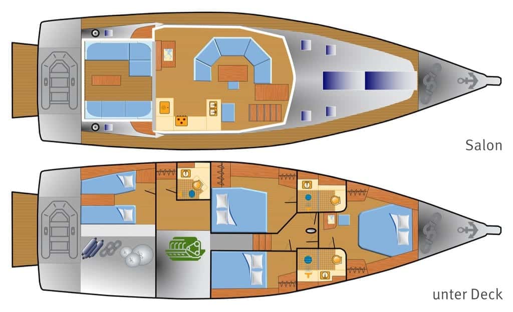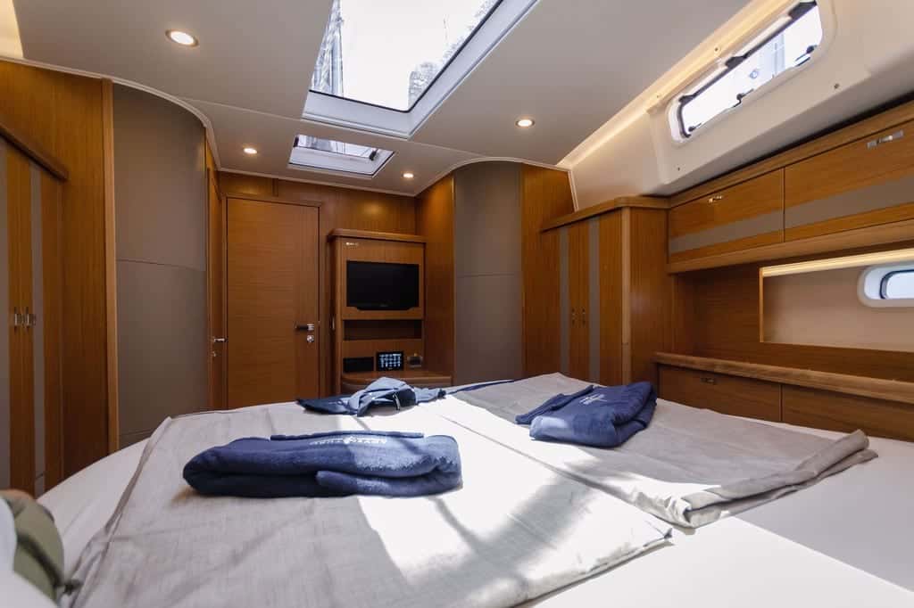 La configuración interior del Moody 54 DS “Adventuro” está pensada para el descanso y la privacidad. La versión armador destaca por una amplia cabina principal en proa con baño privado, mientras que dos cabinas dobles adicionales y una cabina con literas, junto a tres baños, permiten alojar hasta ocho personas durante la noche. El espacio es generoso y cálido, ideal para familias o grupos que desean compartir la travesía sin renunciar a la intimidad de cada rincón.
