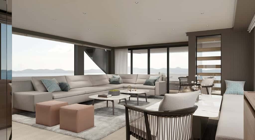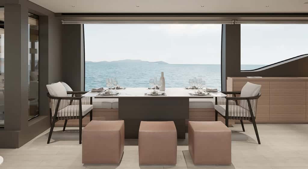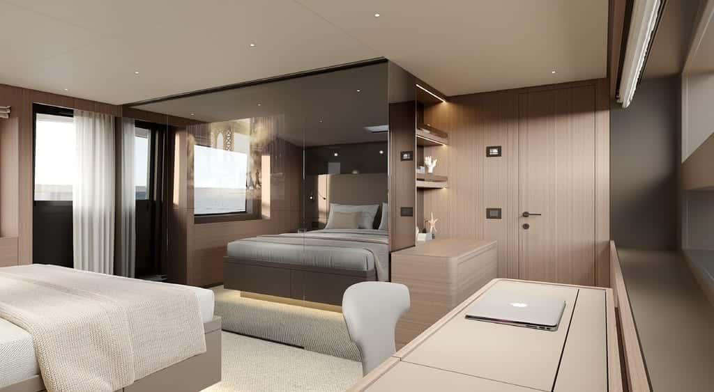 La experiencia se define por el equilibrio entre rendimiento, estabilidad y una distribución inteligente. Sus 4 cabinas dobles, cada una con baño en suite, permiten que hasta 8 invitados disfruten del placer de pernoctar en un entorno sereno. La cabina del armador, ubicada en la cubierta principal, destaca por su amplitud y luminosidad, ofreciendo un refugio privado desde el que contemplar el mar cada mañana.
