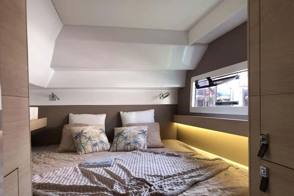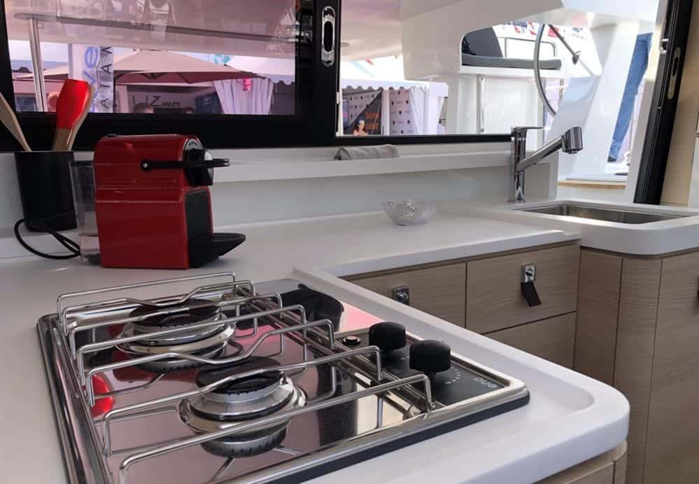Cuatro camarotes dobles con luz regulable, armarios y tomas USB/220V, y dos baños eléctricos con duchas de agua caliente y acabados premium, ofrecen privacidad y confort para compartir el viaje con quienes elijas. El sol acaricia los solariums distribuidos en cuatro zonas y la terraza del techo, regalando espacio y calma para cada invitado. La cocina completa, equipada incluso con plancha exterior, invita a saborear el mar mientras se preparan platos frente a la inmensidad azul.