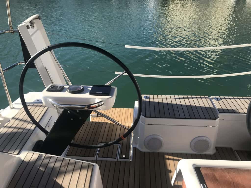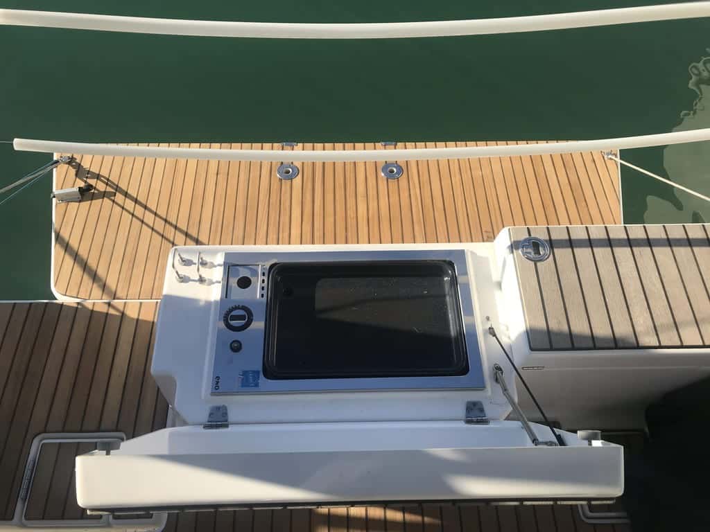 La vida a bordo se despliega sobre una cubierta plana y despejada, donde cada rincón está pensado para el descanso y el disfrute del mar. En popa, la bañera amplia y la mesa extensible se convierten en el epicentro de reuniones y charlas al atardecer, mientras la plataforma de baño con barbacoa y fregadero invita a saborear momentos únicos, rodeados por la brisa y el azul infinito.