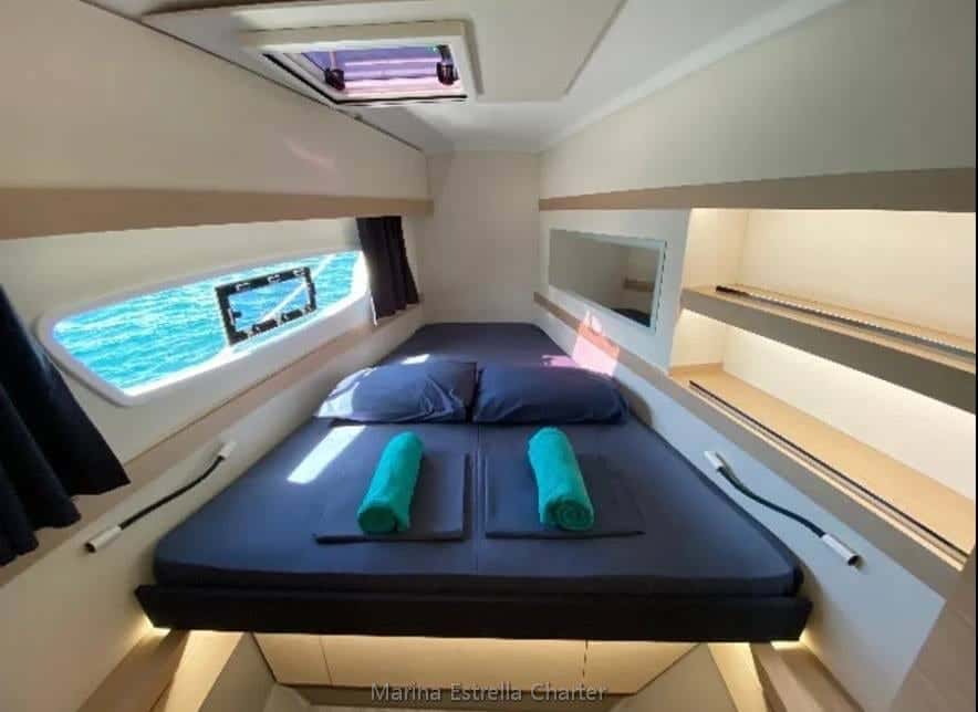 El Lucia 40 está pensado para quienes valoran la amplitud y la comodidad, tanto en navegación como fondeados frente a calas de aguas turquesas. Con capacidad para hasta 10 personas, es el compañero perfecto para grupos de amigos o familias que desean vivir días y noches en el mar, compartiendo charlas al sol, silencios bajo las estrellas y la calma de un interior luminoso y funcional.