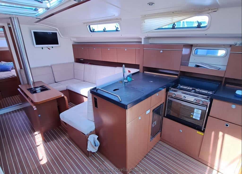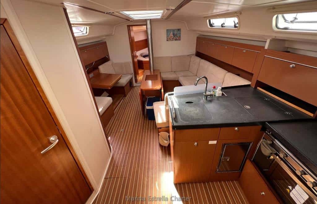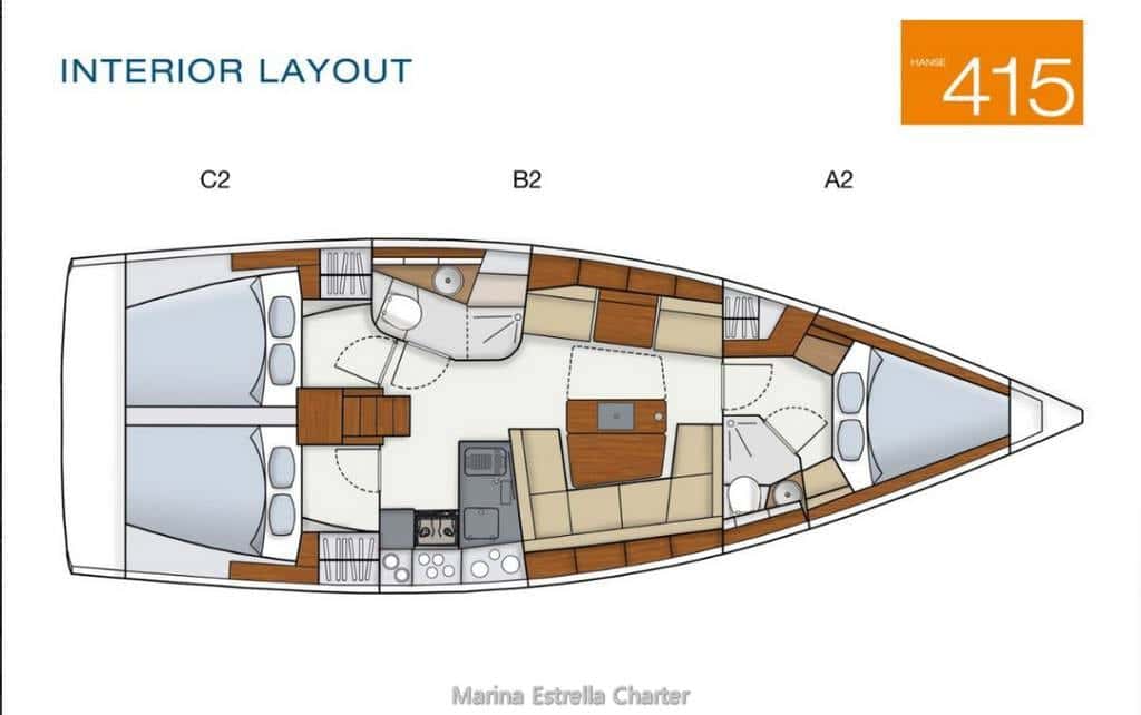 El Hanse 415 está pensado para compartir la aventura. Tres cabinas dobles y dos baños ofrecen el refugio perfecto tras una jornada de travesía, acogiendo hasta ocho personas tanto de día como de noche. El espacio interior, bañado por la luz que se filtra a través de las escotillas, se convierte en el escenario ideal para descansar, conversar y soñar tras fondear en calas de aguas turquesa.