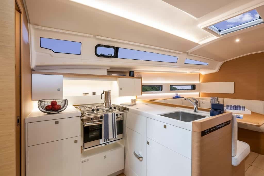 En el interior, la luz natural fluye generosa a través de las ventanas del casco y la cubierta, iluminando un salón acogedor y una cocina en forma de L, perfecta para preparar y disfrutar juntos cada comida. La distribución invita al descanso: una cabina de armador en proa con baño privado, y dos cabinas dobles en popa que comparten un baño completo, creando espacios íntimos y confortables para hasta seis personas durante la noche.