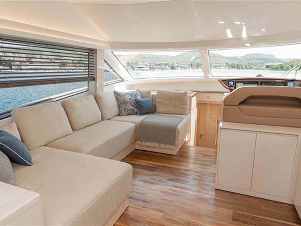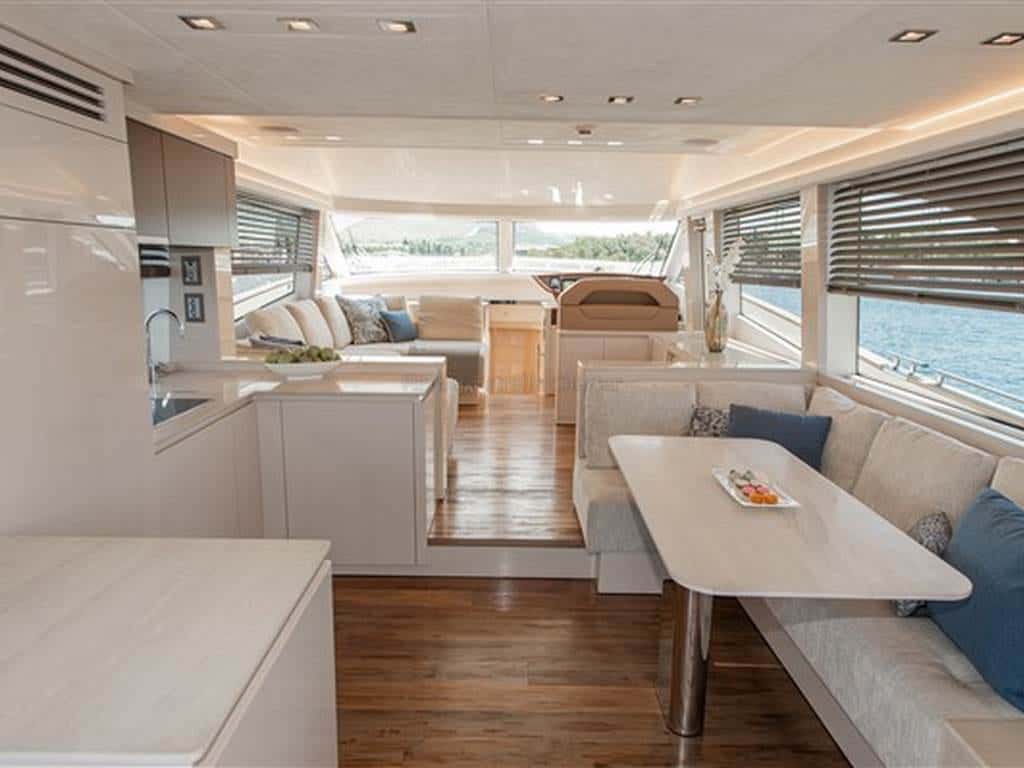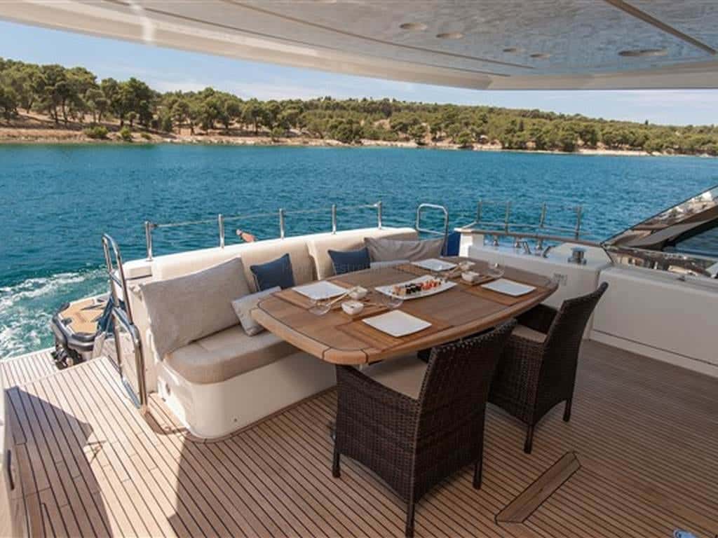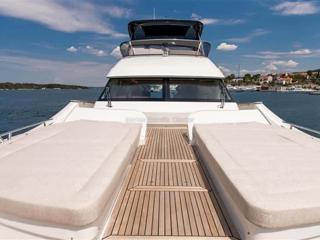 El exterior es un auténtico santuario para los sentidos. El flybridge y la amplia bañera ofrecen rincones abiertos al cielo y la brisa, perfectos para compartir conversaciones al atardecer o simplemente contemplar el vaivén de las olas. En la proa, el solarium bajo el toldo bimini se convierte en el refugio ideal para quienes buscan sol, relax y el placer de no hacer nada más que disfrutar del instante.