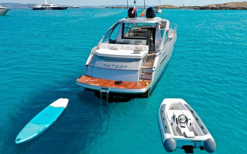 Navegar a bordo del Pershing 5X es entregarse a la esencia del Mediterráneo. Con sus 16,51 metros de eslora, este barco a motor despliega líneas elegantes y modernas, invitando a sentir la libertad del mar en cada milla recorrida. La proa, amplia y acolchada, se convierte en el lugar perfecto para dejarse acariciar por la brisa de Ibiza mientras el sol ilumina el horizonte balear.