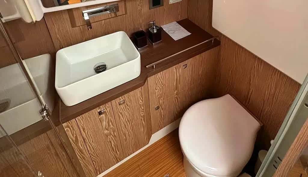 El interior del Salpa 42 acoge un ambiente pensado para el confort y la desconexión. El salón, con su sofá en forma de C, se convierte fácilmente en una cama doble, perfecto para dejarse arrullar por el suave vaivén nocturno. En popa, un segundo espacio íntimo con dos camas individuales y armarios laterales permite que los sueños de cuatro navegantes se entrelacen con el murmullo del agua. El baño independiente, equipado con inodoro marino y cabina de ducha acristalada, añade ese toque de privacidad y frescura que solo los barcos más cuidados ofrecen.