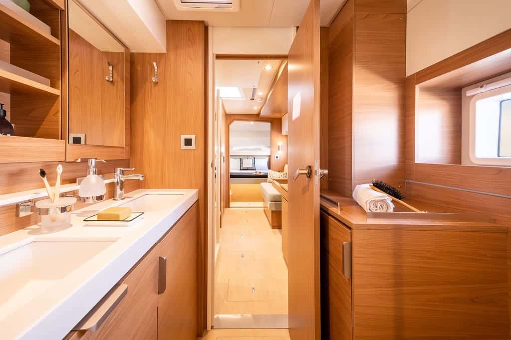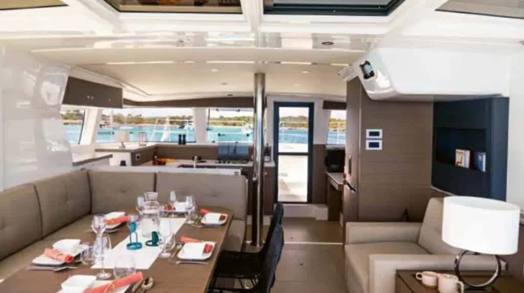 El salón principal es un refugio versátil: puede abrirse para fundirse con el horizonte o cerrarse para crear un ambiente acogedor y protegido, siempre con la famosa puerta Bali que convierte cada transición en un momento especial. La cocina y el comedor, amplios y luminosos, invitan a compartir charlas y sabores entre amigos o familia, con espacio para que hasta diez comensales disfruten juntos del placer de estar a bordo.
