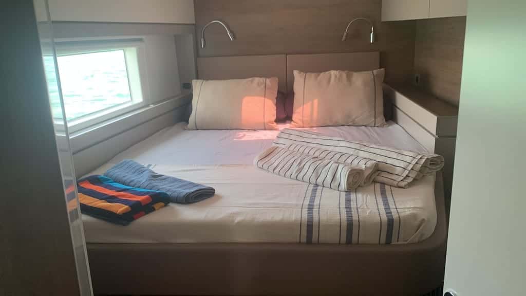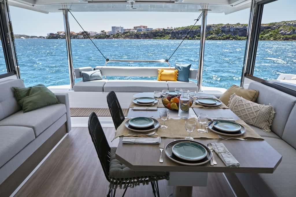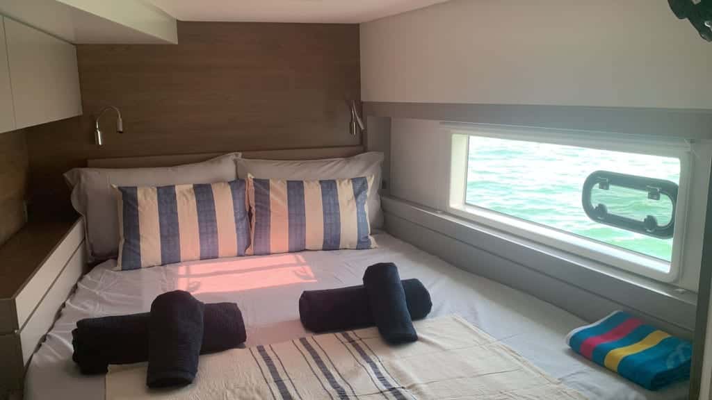 A bordo, la experiencia es compartida: hasta once personas pueden dejarse llevar durante el día por la ligereza del Bali, mientras el suave balanceo del casco multiplica los instantes de calma y contemplación. Cuando cae la noche, ocho afortunados pueden entregarse al descanso y dejarse arrullar por el rumor del agua bajo el casco, sabiendo que la tripulación está siempre atenta para que cada momento sea único y seguro.