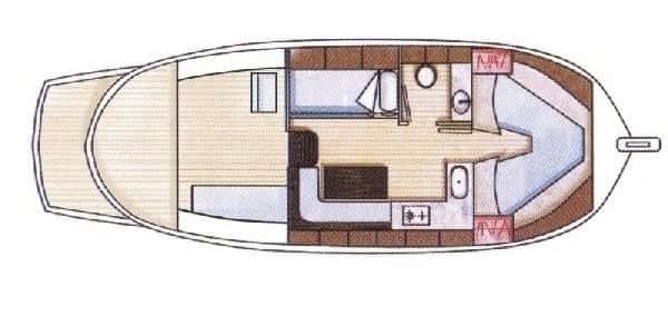 El interior sorprende por su amplitud y calidez: la distribución inteligente ofrece dos cabinas y un baño, creando un refugio cómodo para quienes deciden pasar la noche a bordo. Hasta cuatro personas pueden dejarse arrullar por el vaivén suave de las olas durante la pernocta, mientras que durante el día el barco se transforma en un espacio abierto y alegre para compartir con hasta diez pasajeros.