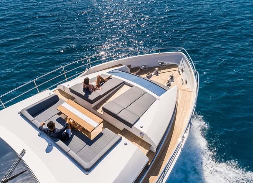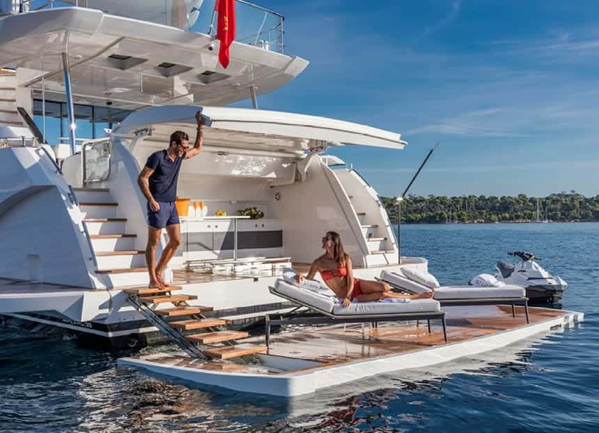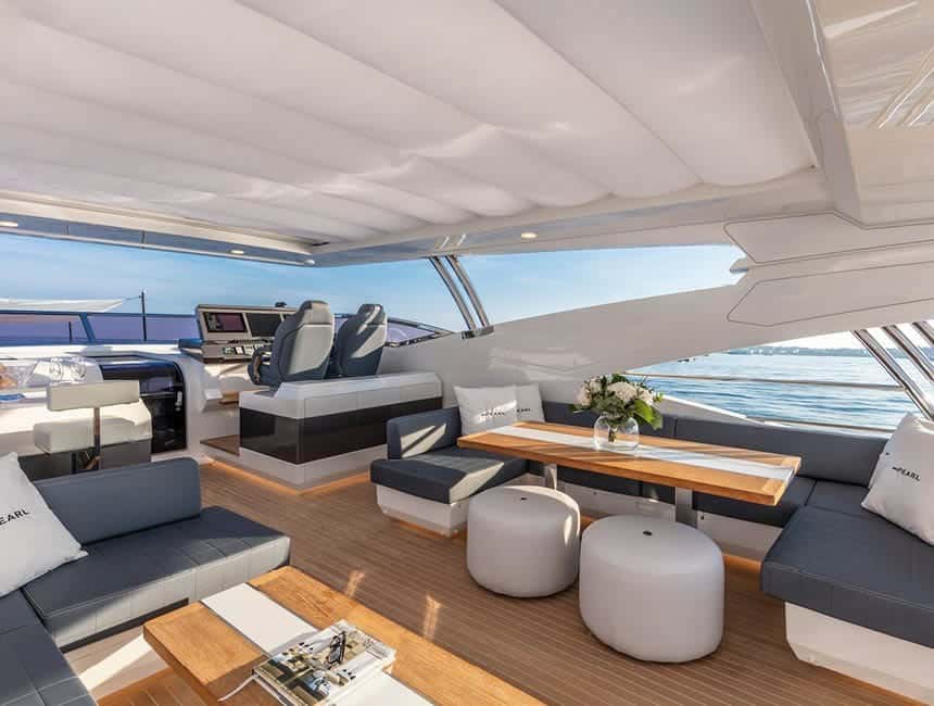 Die Pearl 95 empfängt ihre Gäste in hellen und großzügigen Räumen, in denen das Licht des Meeres durch große Panoramafenster strömt, den Hauptsalon erhellt und das Innere mit der maritimen Landschaft verbindet. Ihre Innenaufteilung priorisiert Privatsphäre und Weite, mit fünf Doppelkabinen—alle mit eigenem Bad—die für bis zu zehn Gäste über Nacht und bis zu zwölf Personen tagsüber ausgelegt sind. Die Trennung zwischen Crew- und Gästebereichen gewährleistet einen diskreten Service und einen ruhigen Aufenthalt zu jeder Zeit.