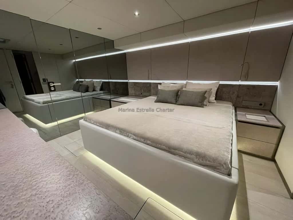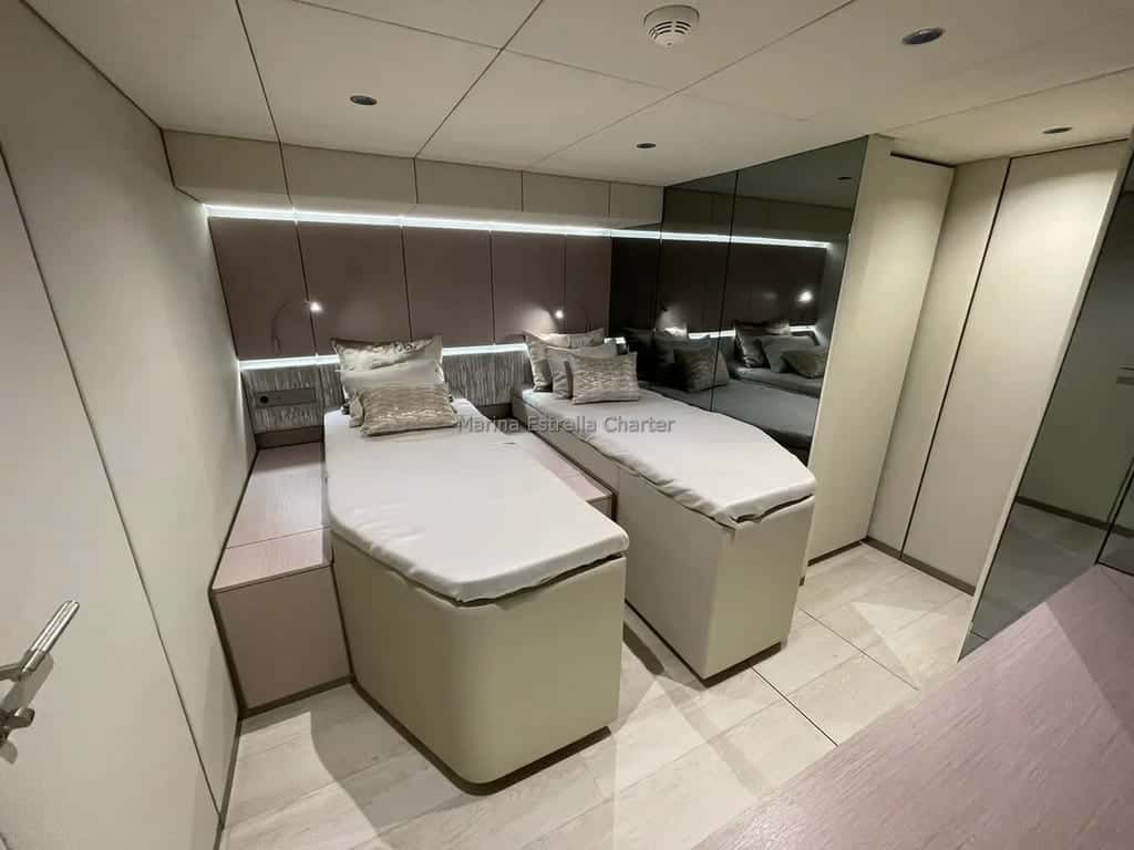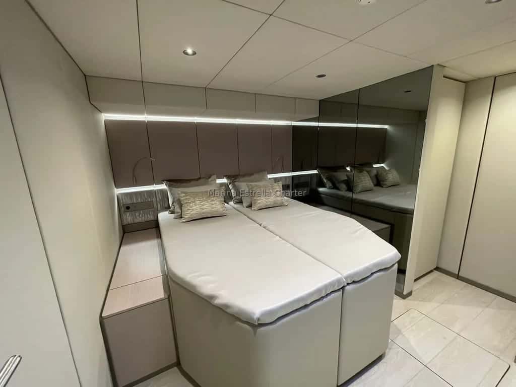 The Sunreef 70, model 2022, showcases impeccable nautical architecture: its hull and superstructure have been designed to maximize light and comfort, creating an enveloping atmosphere that invites calm and togetherness. On the lower deck, four cabins —three doubles and one convertible— accommodate eight guests with modern and elegant furnishings, allowing each night on board to become a deep rest after days of sailing.