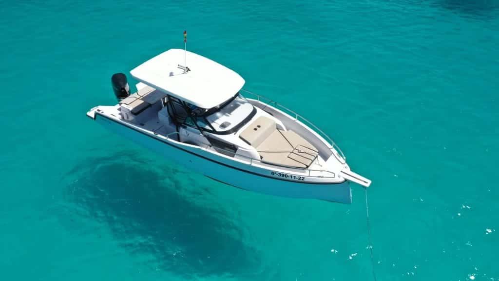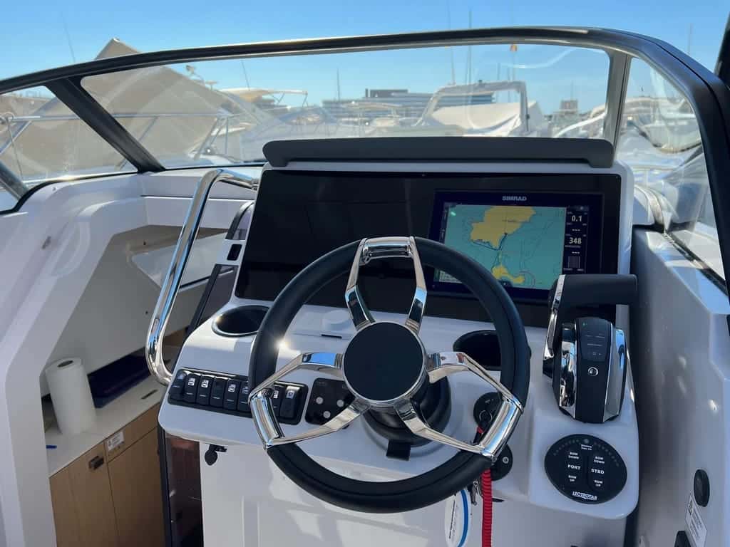 L'extérieur du Rick 280 est conçu pour le plaisir de la navigation et la détente. Le poste de commande, moderne et fonctionnel, s'intègre dans un espace où la vue et le vent accompagnent chaque manœuvre. Deux généreux solariums, l'un à l'avant et l'autre à l'arrière convertible, deviennent des refuges parfaits pour se laisser caresser par le soleil ou contempler la transparence de l'eau ancrés dans une crique de Formentera. Tout est pensé pour le plaisir : échelle de bain pour des plongeons spontanés, douche extérieure, réfrigérateur, grill et évier, permettant à la journée de s'écouler sans soucis.
