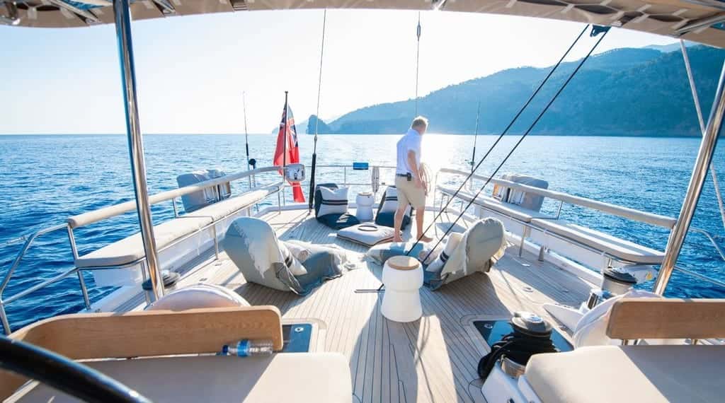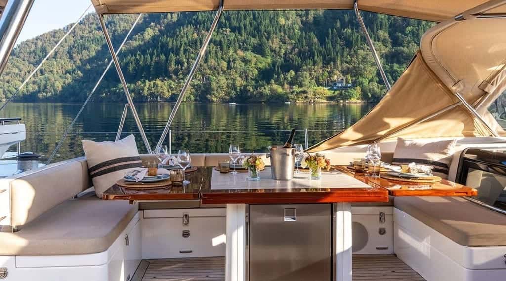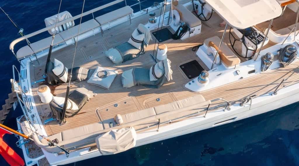 Sur le pont, la grande zone de poupe devient le cœur de la vie à bord. Des canapés spacieux, une salle à manger extérieure, un réfrigérateur et un barbecue invitent à de longues soirées en plein air, dégustant des saveurs locales tandis que le soleil se retire sur les eaux calmes d'une crique cachée. La plateforme de baignade hydraulique descend jusqu'au niveau de la mer, créant votre propre "beach club" flottant, parfait pour des plongeons spontanés ou pour se lancer à l'aventure avec le tender, le paddle surf, l'e-foil ou l'équipement de snorkeling, transformant chaque mouillage en une journée de plage inoubliable.