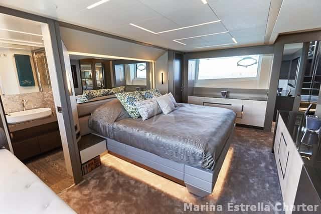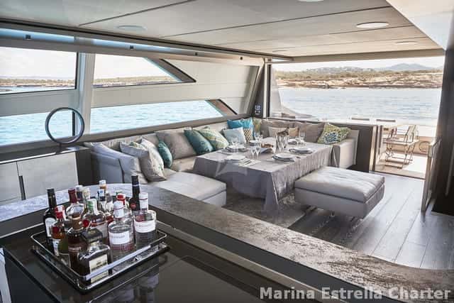 Sa terrasse arrière devient le cadre parfait pour partager des rires et des moments inoubliables en groupe, tandis que la zone avant, avec ses transats et ses sièges, invite à la détente sous le soleil baléare. Le nouveau flybridge, avec ses lignes avant-gardistes, est l'endroit idéal pour contempler la côte au coucher du soleil, laissant la brise marine envelopper chaque instant. Les espaces à bord, vastes et soigneusement agencés, offrent la possibilité de profiter à la fois de la compagnie et de ces moments d'intimité que la mer offre.