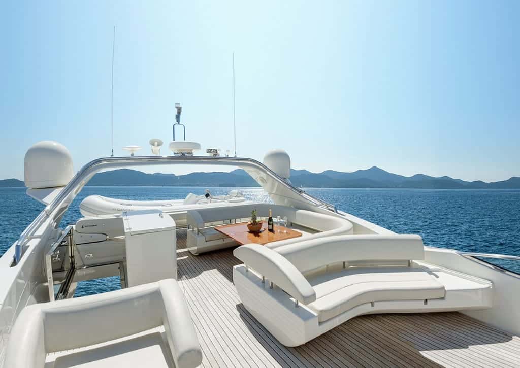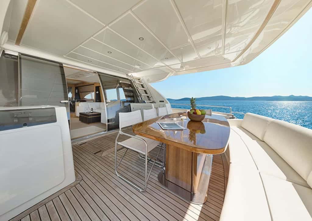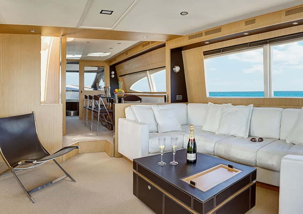 Al cruzar su umbral, la luz natural inunda el interior gracias a las amplias ventanas panorámicas, realzando las maderas nobles y la tapicería de lujo que visten el generoso salón y el comedor. El flybridge, con su zona de relax y solárium, se convierte en el escenario perfecto para sentir la brisa marina y contemplar el horizonte, ya sea durante una travesía tranquila o anclados frente a una cala escondida.