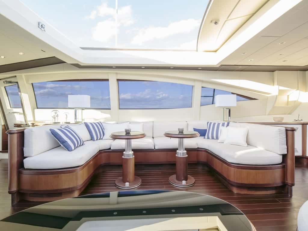 Nel Mangusta 92, il tempo acquista un ritmo diverso. La luce mediterranea si insinua nel spazioso salone, dove i divani invitano sia all'incontro che alla contemplazione. Mentre l'equipaggio prepara cocktail al bar, gli ospiti possono lasciarsi trasportare dalla conversazione, da una partita a backgammon o dalla contemplazione dell'orizzonte attraverso il tetto retrattile che inonda di sole l'interno. All'esterno, le terrazze di prua e poppa offrono lo scenario perfetto per lasciarsi abbracciare dalla brezza, condividere un pasto a bordo mare o semplicemente dedicarsi al piacere di non fare nulla sotto il cielo aperto.